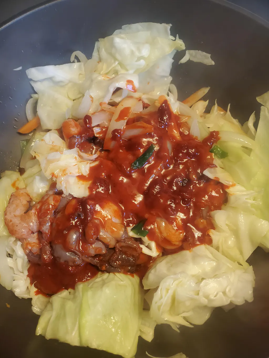 2. 중불로 예열한 팬에 해동한 내용물을 넣고 낙지가 익을 때 까지 약 5~10분간 볶아주세요.